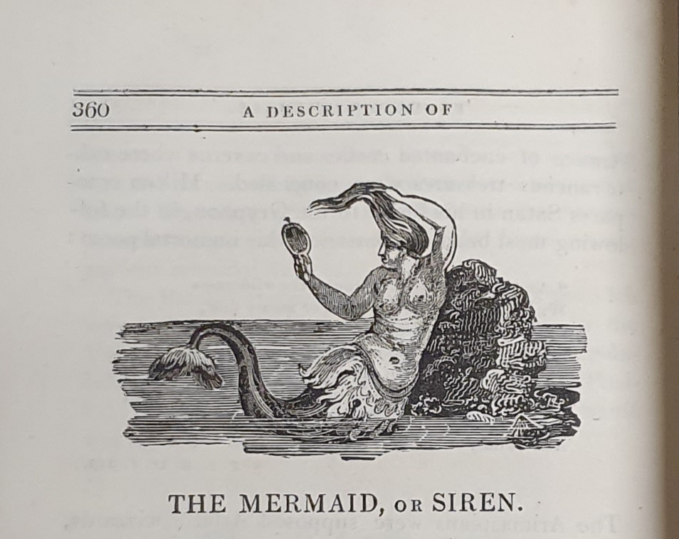 Our next rare book to include aquatic beings is the ‘A description of more than three hundred animals’ (1812) from publisher Thomas Boreman. Containing many different types of animals, insects and fish, this book lists real creatures alongside mythological ones. Like medieval bestiaries these books often didn’t distinguish between the ordinary and the fantastical, so alongside the walrus and shark, you’ll find the mermaid and siren. American Entomologist Harry B. Weiss clearly does not believe that Boreman based these entries on reputable sources. Going so far as to write