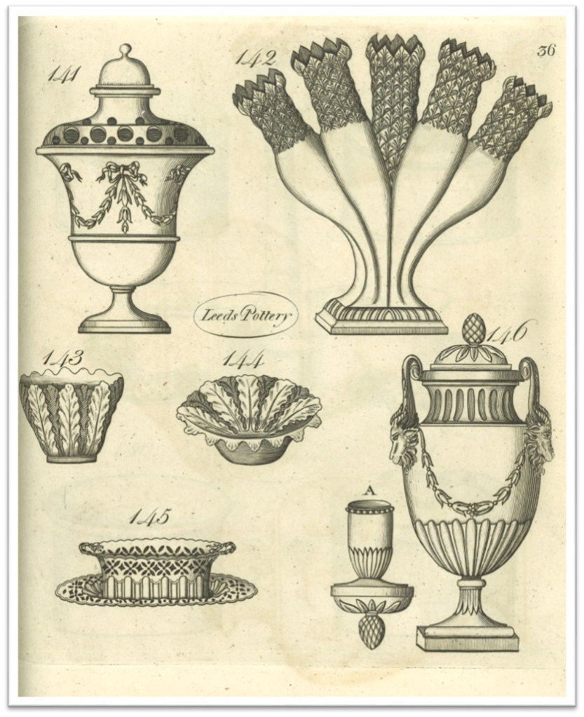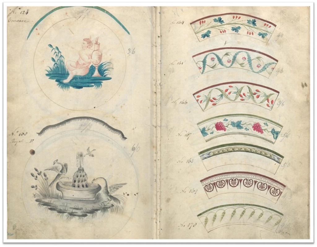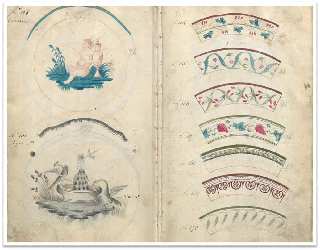 The Pottery is represented at the Central Library through nine drawing, pattern and Published design books. Images from both can be seen below: the drawing and pattern books being visual guides for company potters and decorators and the published design books probably being used by agents for advertising and sales purposes, with several designs translated into French, German and Spanish – a sign of Leeds’ place in international networks of trade, taste and influence. The Industrial Revolution had taken the Leeds name around the world, creating a longstanding reputation for excellence