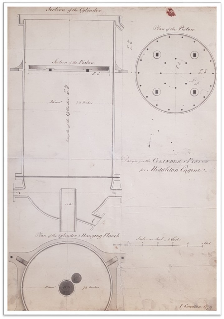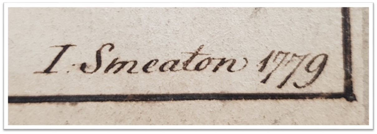 Factories brought demand for coal, but also for machinery; both brought a need for talented and innovative engineers – men such as John Smeaton. The plans which you can see above, dated 1779, are almost certainly from the Smeaton workshop, and possible drawn up by the man himself, most likely for the steam engine-driven pumping house in operation at Middleton Colliery from 1780. The attribution to Smeaton is proved by his signature – or, at least, a copy of his signature – which you can see in the smaller image below.
