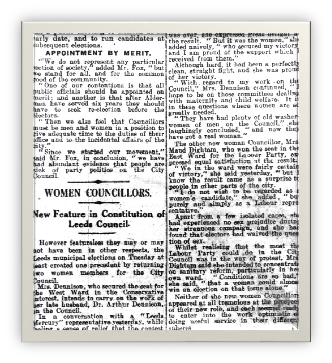 Quinn was not the first woman elected as a local councillor in Leeds, however. That honour went, in 1921, to two other women: Gertrude Dennison, for the Conservatives, and Maud Dightam, for Labour.