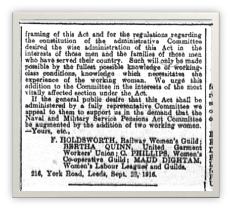 Maud Dightam was probably present at the 1908 Coliseum protest. She was certainly active in local socialist and suffragette movements during the same period; indeed, Maud and Bertha Quinn were co-signatures to a letter published in the Yorkshire Post in 1916, calling for the Council committee administrating the Naval and Military Services Pensions Act to substitute the five women of the “leisured classes” on the committee for working women.