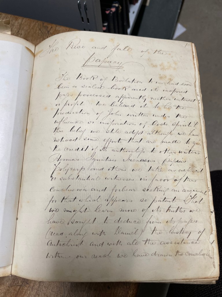 Secondly, we know that the contents of the manuscript are theological in nature. Our catalogue entry for this book tells us it consists of 16 essays on themes such as the ‘Rise and fall of the Papacy’ and ‘Immortality of the soul’.