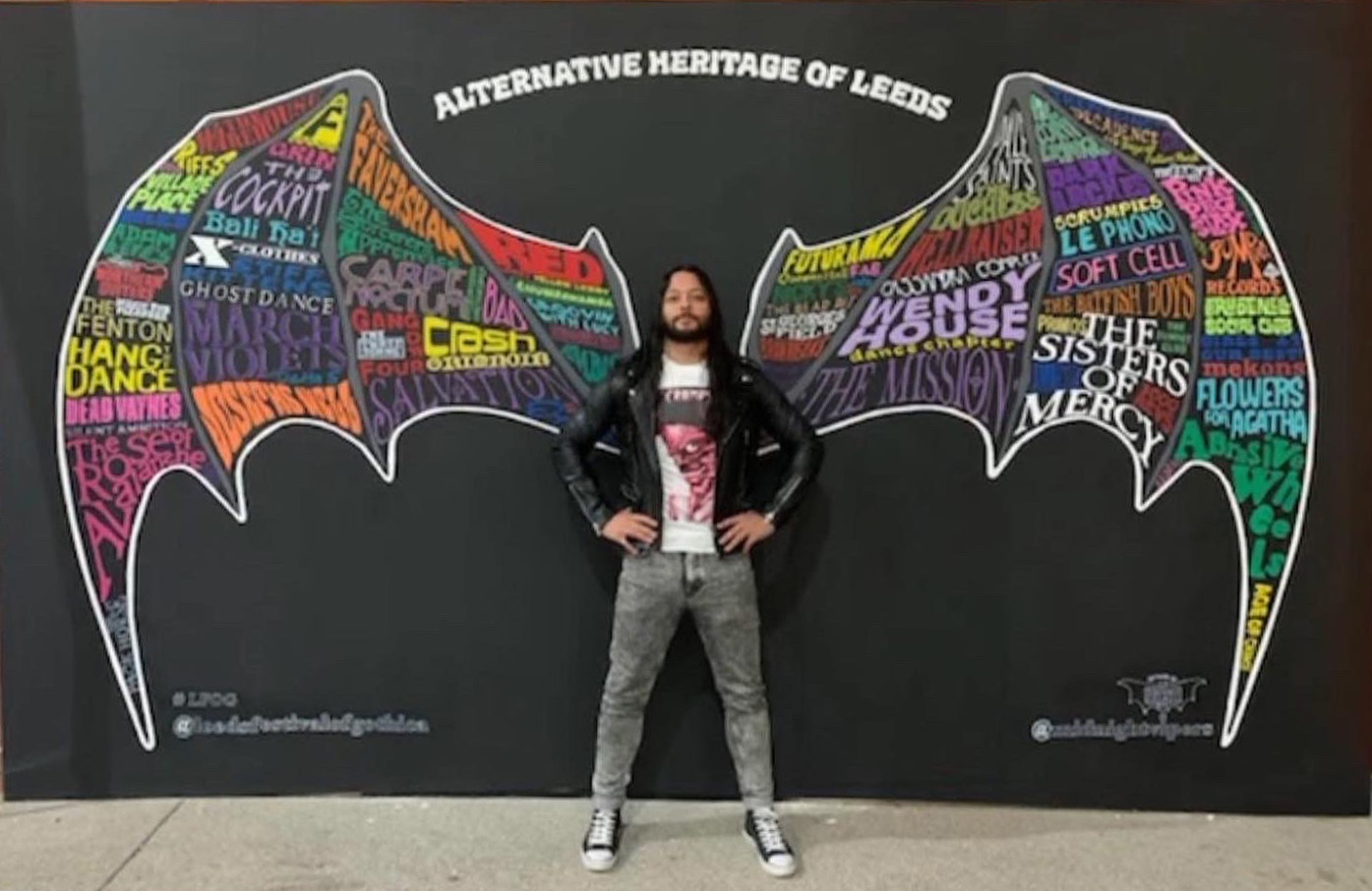 Leeds has a rich alternative heritage but was influential in birthing the goth subculture as we know it today. Other cities celebrate their musical history and shape their events and tourism around it, Liverpool sings its love for Mersey Beat and Manchester bangs the drum for the Indie scene. Leeds however has been somewhat quiet in championing its alternative subcultural roots. Leeds Festival of Gothica wanted to shine a spotlight on the alternative heritage of Leeds in a way that involved the community and showcased the diverse spectrum of the scene and its musical genres. We also wanted to create an accessible archive of images to ensure the scene is conserved for posterity. Over a few drinks in Northern Guitars with artist Johnny Cosmic (@midnightvipers) the idea of a mural that people could stand within to create a shareable image for social media was born. A pair of batwings would be used to represent nightlife (with a subtle nod to goth) which would hold all the information regarding the alternative heritage. We now had an artist and concept mural!