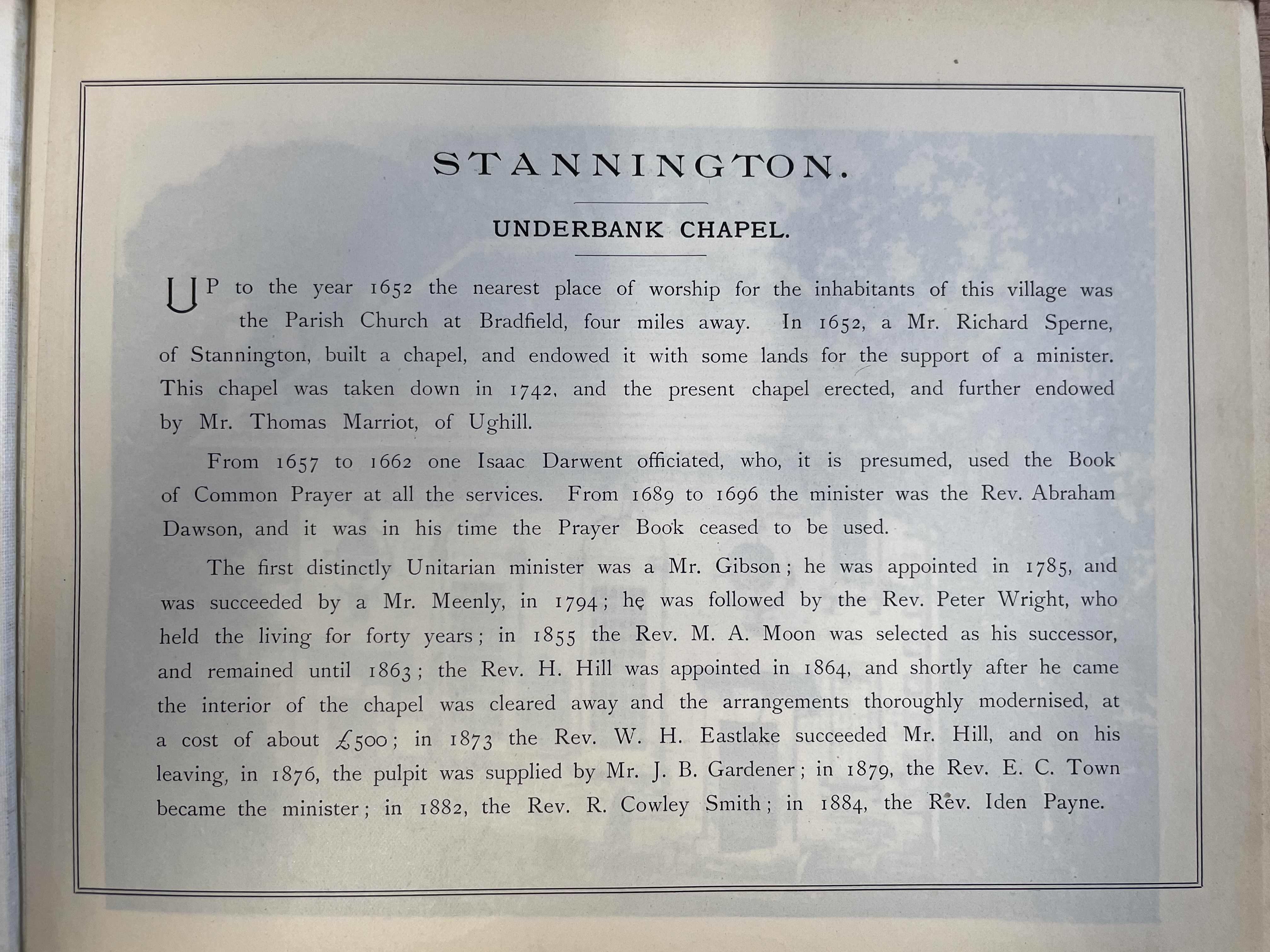This is a really nice volume, a collection of images and historical notes about Unitarian Chapels across Yorkshire. According to a note at the front of the book – which was printed by H. Graham Glen of Wortley – the volume was intended as a souvenir of the Yorkshire County Bazaar and also as a fund-raising effort for the Yorkshire Unitarian Union, a district association formed in 1815.