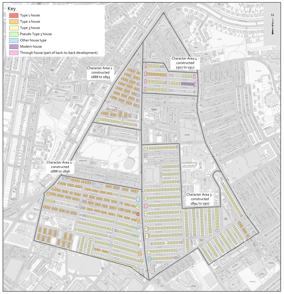 Figure 1 Development of the Harehills Triangle and its back-to-back house types. (Background map: Ordnance Survey (GB) 2018. © Crown Copyright and Database Right (2018) OS (Digimap Licence))