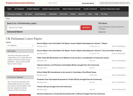A searchable archive of Parliament and Official documents. You can view material from the Westminster Parliament, Scottish Parliament, Northern Ireland Assembly, Welsh Parliament (Senedd), and non-Parliamentary material. Whether you want to look at an Act and its amendments or track a Bill at Hansard stage, the Public Information Online website provides easy to use, unlimited access to official publications.