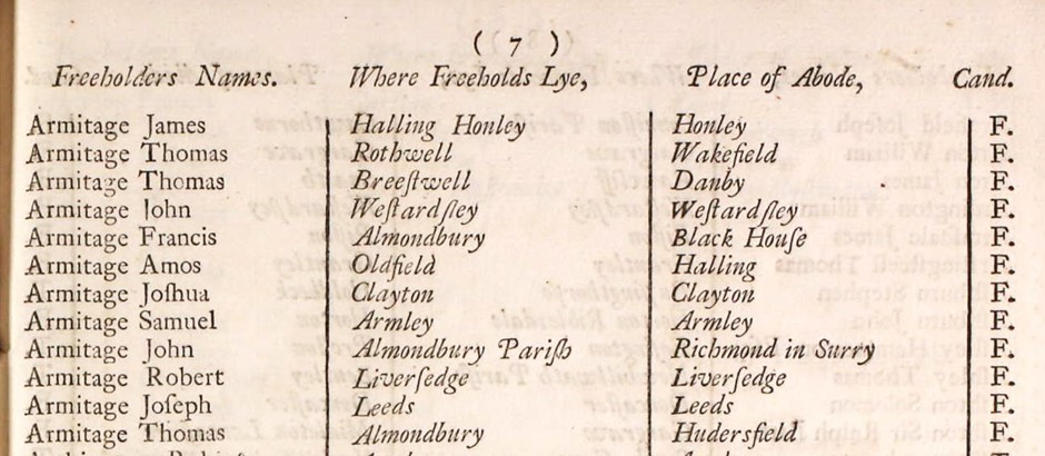 - He did not necessarily live in the qualifying freehold. Six of those in this extract didn’t. However, the inclusion of John Armitage, resident in Surrey, on the Yorkshire Poll tells us that a qualifying freehold in Yorkshire did not entitle him to vote in Surrey. He had to travel (or send a proxy) to York to exercise his vote. This might mean we have to be prepared to look wider for proof of an ancestor’s right to vote.