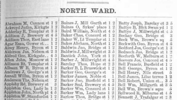 - Within the polling districts/divisions, voters are listed in alphabetical order by surname. However, Leeds was divided into 31 polling districts, so finding your ancestor can be difficult, particularly if they tended to move about between adjacent districts, e.g. between Hunslet and Holbeck. Also some districts are sub-divided into two or even three divisions.