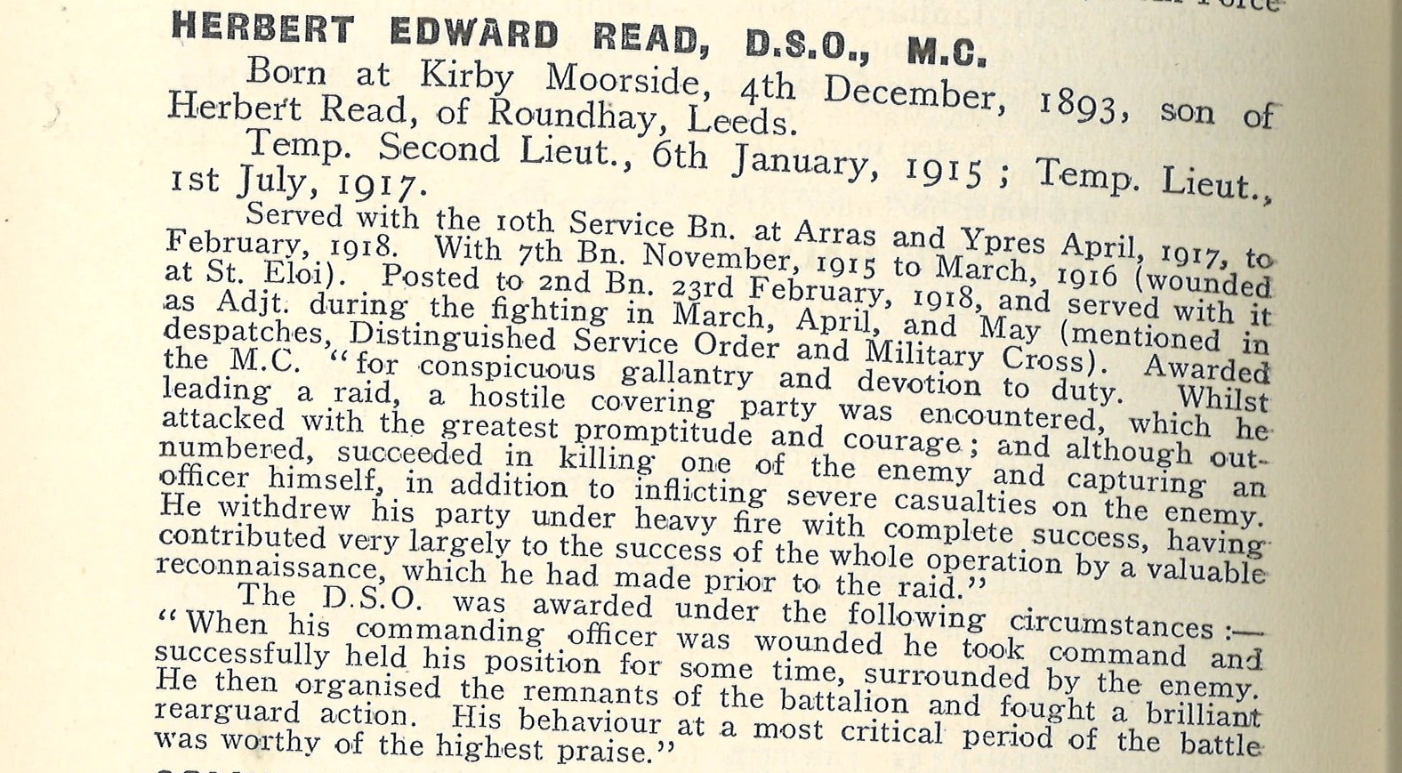 Herbert Read was born in the North Riding of Yorkshire in 1893. The Read family lived at Muscoates Grange near Nunnington, about four miles south of Kirbymoorside.