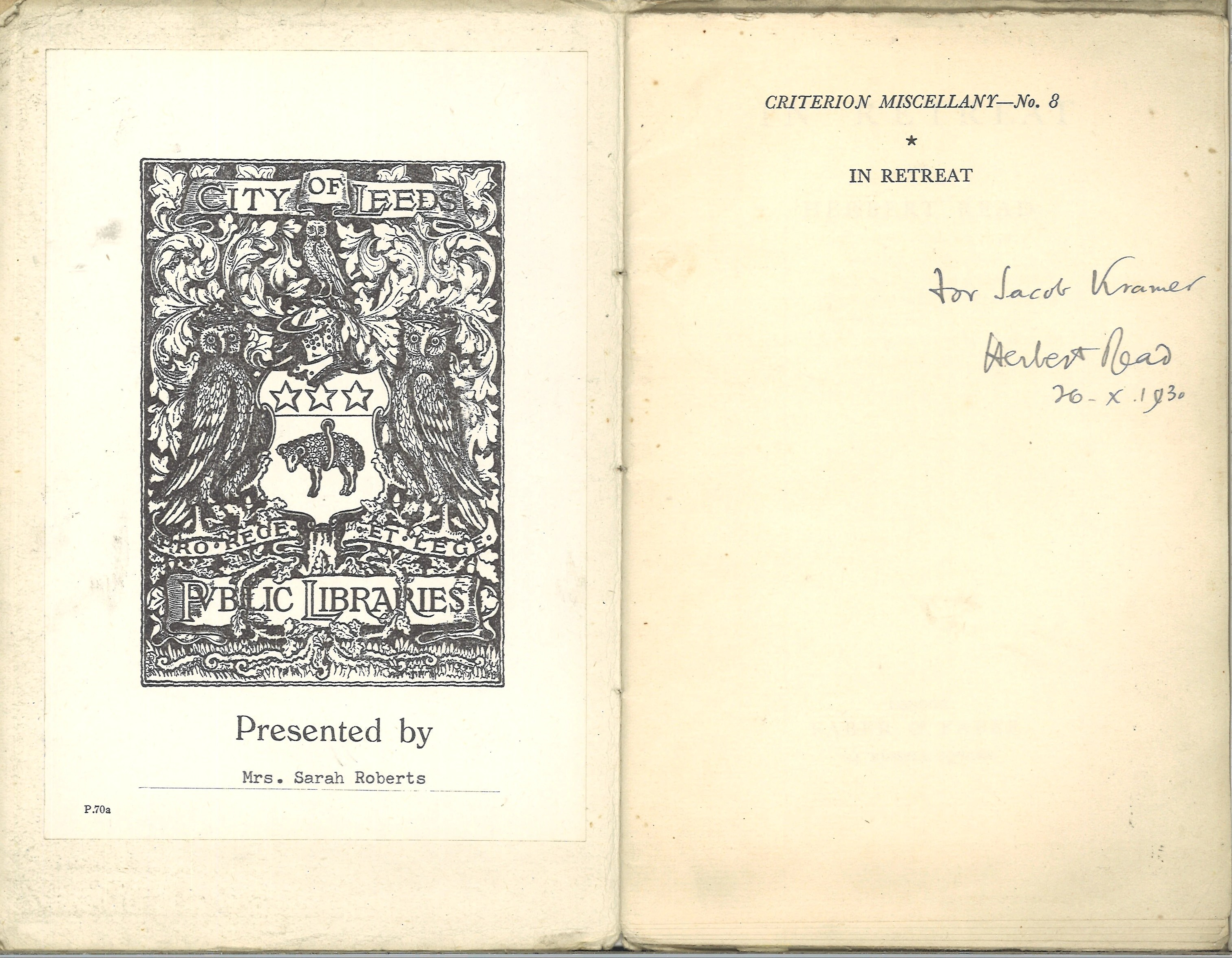 Herbert also encountered the artist Jacob Kramer at the Arts Club – Kramer and Read became friends and, in the Central Library’s Jacob Kramer collection, can be seen a book gifted to Kramer by Read.