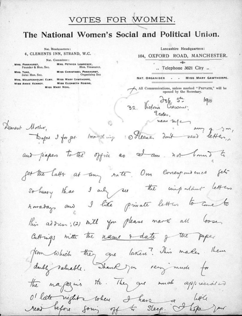 Other Heritage Volunteers have been tackling the Mary Gawthorpe papers and trying their hand at transcribing some of the handwritten letters included in this collection. Gawthorpe was a teacher, suffragette, trade unionist, socialist and editor. Born in Leeds in 1881, she emigrated to the USA in 1916 and spent the rest of her life in the New York area. After her death, her papers were deposited with the New York University Tamiment Library but Leeds secured copies of these on microfilm. Over the years many researchers have used these papers but some of the correspondence is quite difficult to read. Our volunteers have been transcribing some of the handwritten letters to make it easier to use these documents. Here’s an example of a letter from Gawthorpe to her mother, which is one of the easier ones to read.