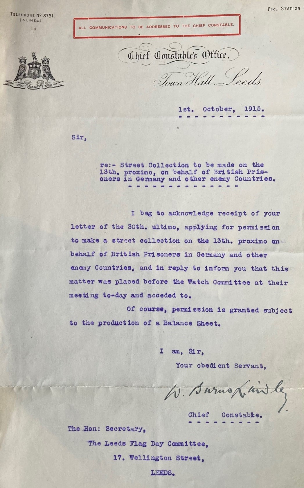 ‘The work I have been completing for the libraries consists of reviewing letters about the Leeds Flag Days held during the First World War to raise funds for a variety of causes. It has been fascinating to discover the range of groups who benefited from these funds including Comforts for ‘Leeds Lads at the Front’, ‘Sailors and Minesweepers’ and ‘Blinded Sailors and Soldiers’. Charities at home were also supported such as Leeds Children’s Charities and the Lord Mayor’s Local fund for ‘dependents of Soldiers’.