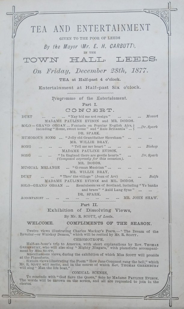 The concert part of the entertainment IS lovely. Dr Spark was the official organist of Leeds Town Hall so to listen to him was a great treat. Madame Pauline Evison seems to have been a jobbing soprano from Hull, according to her advert in the Musical Times, and her numerous mentions in the Leeds press.