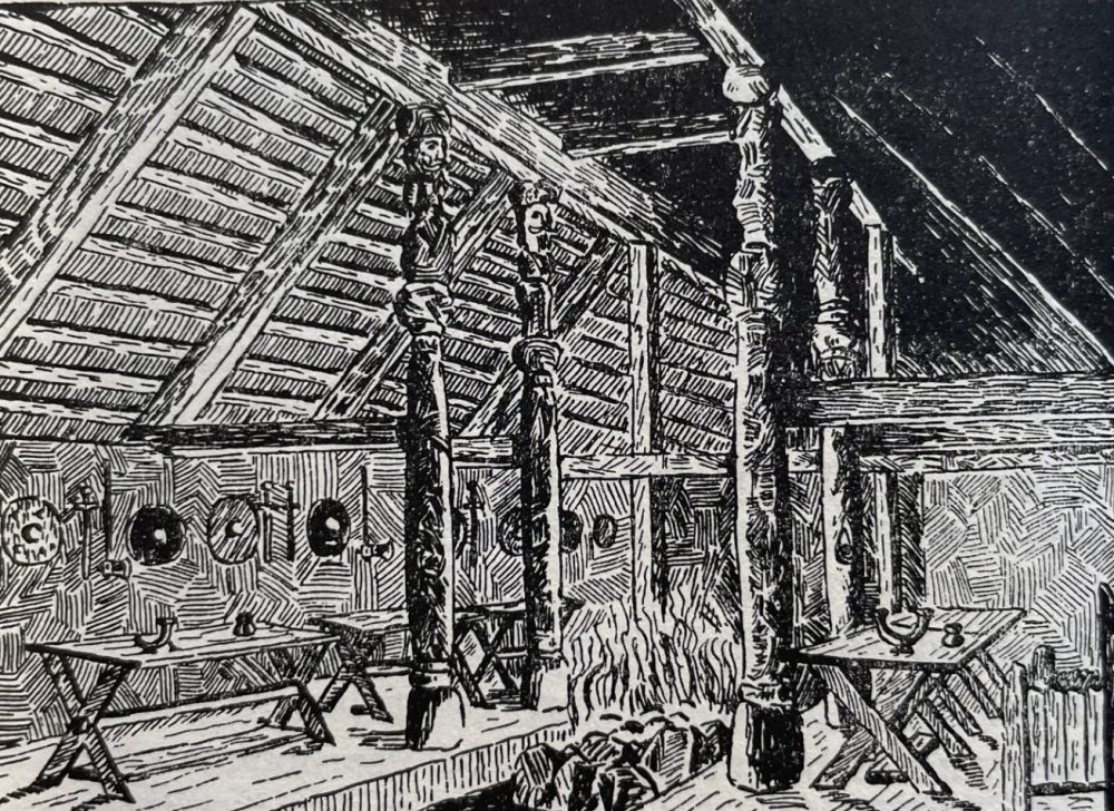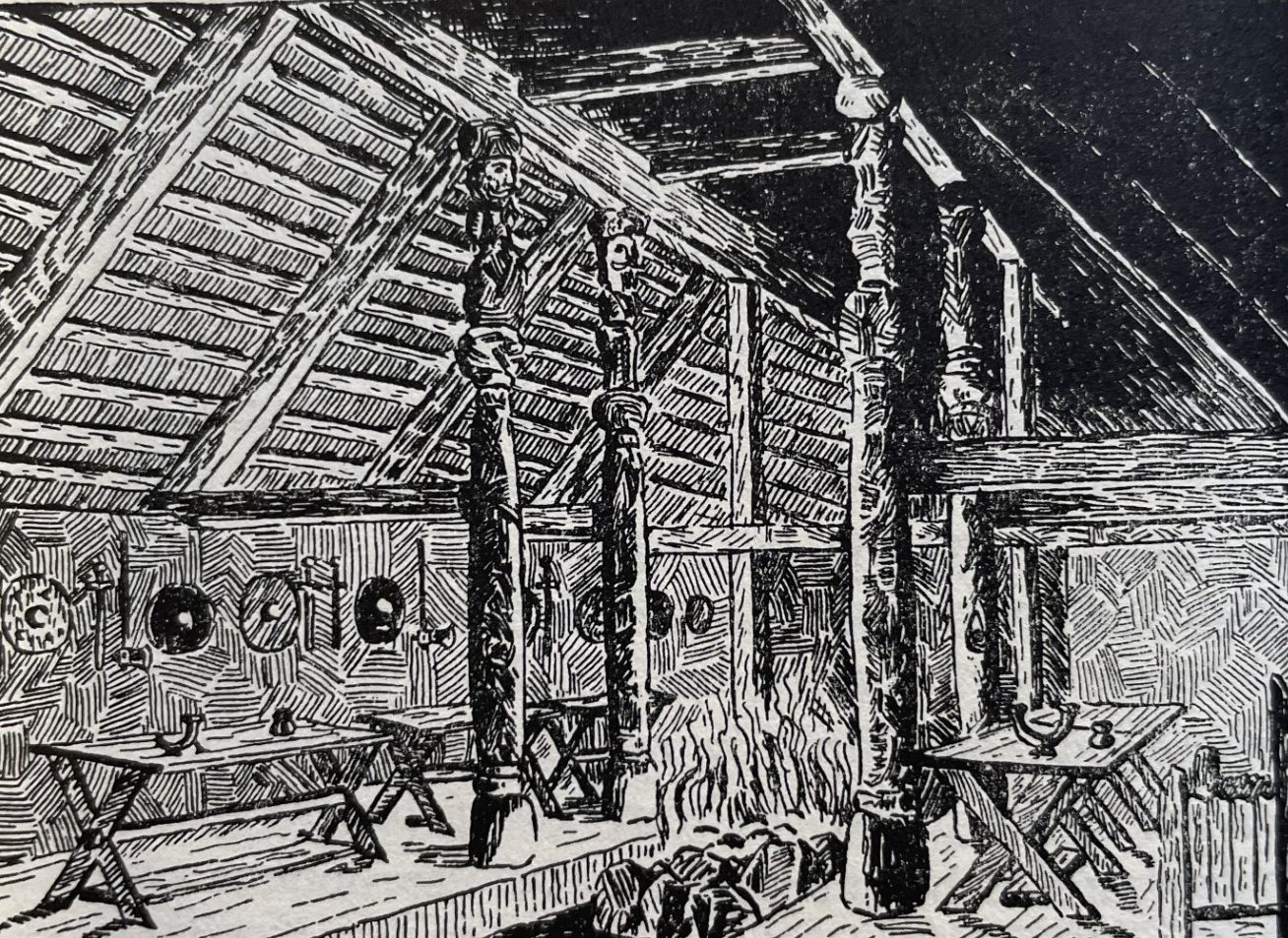 Another one of those connections has recently come to light. In his 2012 book There and back again: J.R.R. Tolkien and the origins of The hobbit (recently acquired by Leeds Libraries as part of our 2023 Fantasy exhibition), Mark Atherton describes Tolkien’s inspiration for his illustration of Beorn’s Hall in The Hobbit (1937):