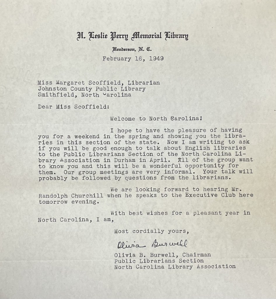 Johnston County utilised a bookmobile and Scoffield talks of her trips out on this mobile library and the sights she witnesses. She speaks of leaving 50 books at a store for local residents to chose from, leaving a dozen books for a family on a farm and multiple books at the local school – “And so having brought books to the people who only a few short years ago had nowhere to turn for them, we return”.