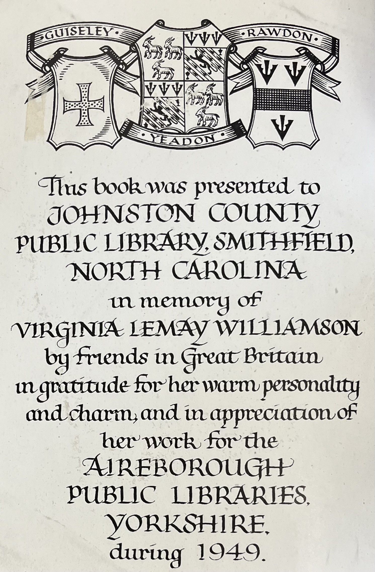 Williamson returned to her role in Johnston County in January 1950 but tragically lost her life in a car accident shortly afterwards. Her death was deeply felt by both library authorities and a Book Memorial Scheme was set up in her name. Aireborough Libraries raised money to send 171 books to North Carolina. The North Carolina Library Association sent books to Aireborough and Johnston County Libraries. 170 books were received by Aireborough, mainly children’s literature – very fitting and would no doubt have pleased Williamson greatly. Scoffield notes “I do not think parents need fear an undue American influence on their children from these books. The high standard of writing will counteract, rather than intensify, the effect of Americanisms learnt from the cinema.” (Readers’ News, Aireborough Libraries 1951)
