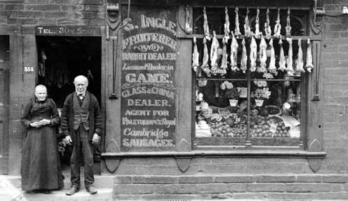 Black and white photo of a sausage shop, with shopkeepers stood outside.