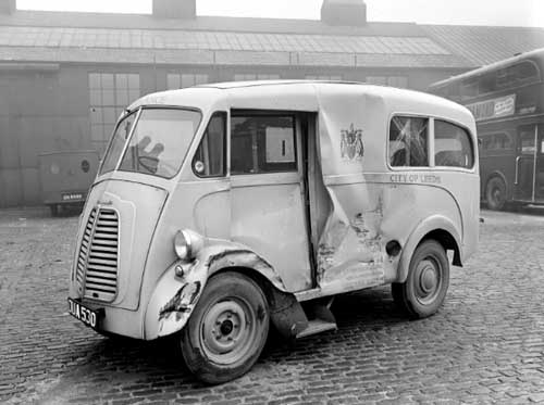4th January 1952. View shows a Leeds Public Health Department ambulance shortly after a crash with the side bodywork caved in. It is pictured in the Leeds City Transport Works Yard on Donisthorpe Street. (c) Leeds Libraries, http://www.leodis.net