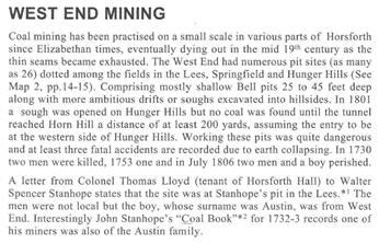 Over the years Horsforth has unfortunately had its fair share of tragedies. A number of men were killed during the construction of the Bramhope tunnel and many more have perished in coal mining accidents during the eighteenth and nineteenth centuries. Over the years Horsforth has had several pits, comprising mostly of shallow Bell Pits. Working these pits could be extremely dangerous and at least three fatal accidents are recorded due to the earth collapsing. This included the Hunger Hills pit disaster of 1806 when two men and a local boy were trapped and died. Please see Horsforth History Guide Number 9 (Horsforth West EndL HOR 942)