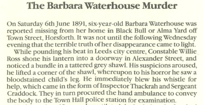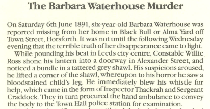 Another tragic story from Horsforth’s past can be found in Horsforth History Guide Number 5, (The Green L HOR 942). On 10 June 1891 the body of six-year-old Barbara Waterhouse was found in a doorway in Alexander Street in Leeds City Centre, just to the rear of the Central Library. Her murder shocked the people of Horsforth, who had been searching for her since she was reported missing from her home in Alma Yard four days earlier.