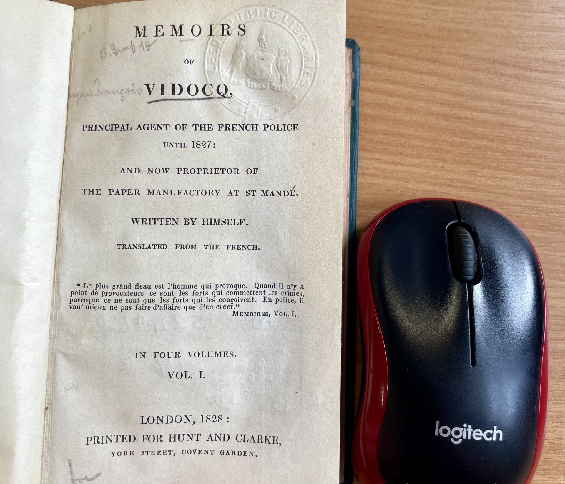 And, on that point, a quick search of our online catalogue reveals our Central Library holds an 1828 first (English-language) edition of Memoirs of Vidocq, principal agent of the French police until 1827 : and now proprietor of the paper manufactory at St. Mandé. Here it is –