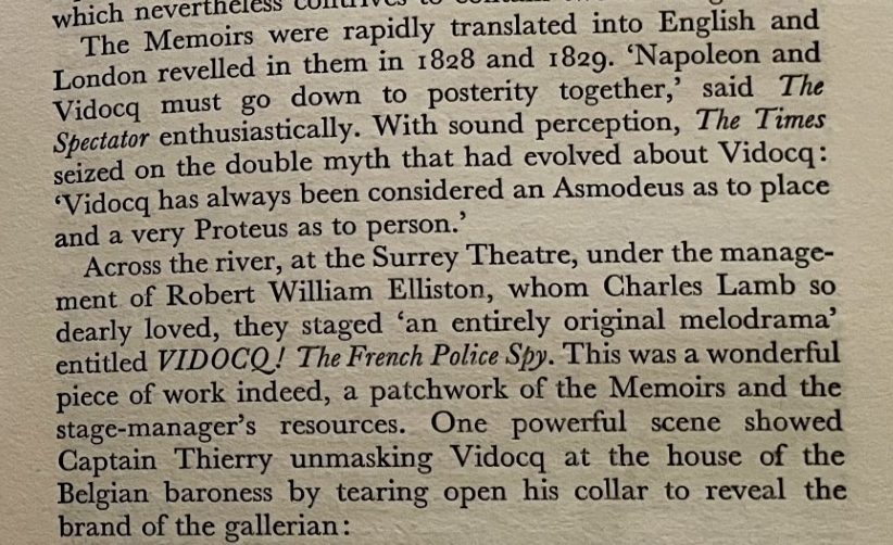 So, anyone interested in Vidocq’s amazing life and times is directed to Philip John Stead’s 1953 biography, which certainly is available to take home and read – and, at a modest 263 pages, surely won’t take too long to digest. Pages 122 – 125 of Stead’s book look at the life and afterlife of Vidocq’s memoirs and the impact of the English-language edition in particular.
