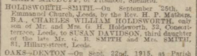 Although no year was recorded on the pages supplied our diarist recorded both days and dates which could only make it 1915. The next step was to consult the marriages column of the Mercury and there it was: on Saturday 25th September 1915 the marriage of Charles Holdsworth to Susan Davidson Smith of 81 Hillary Street Leeds.