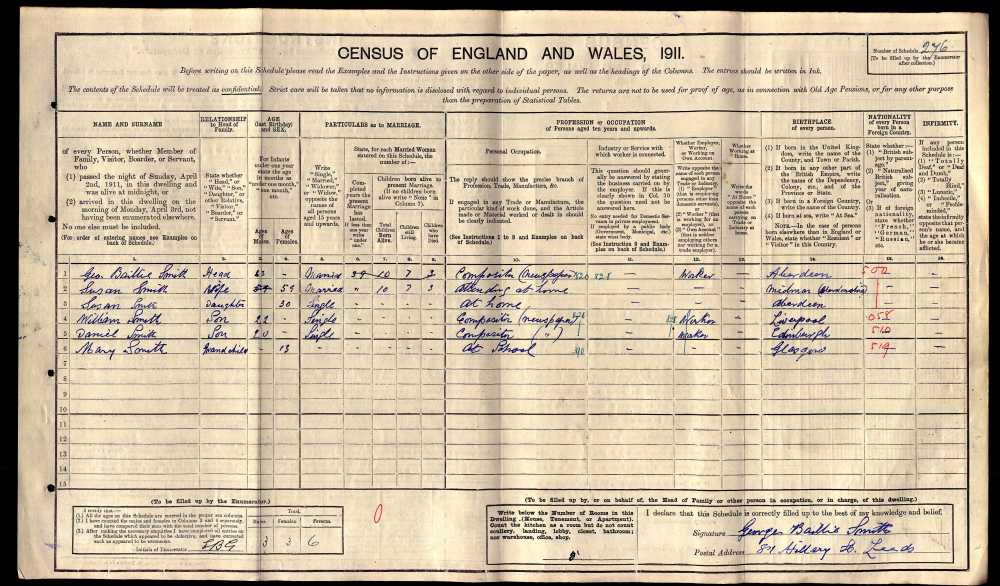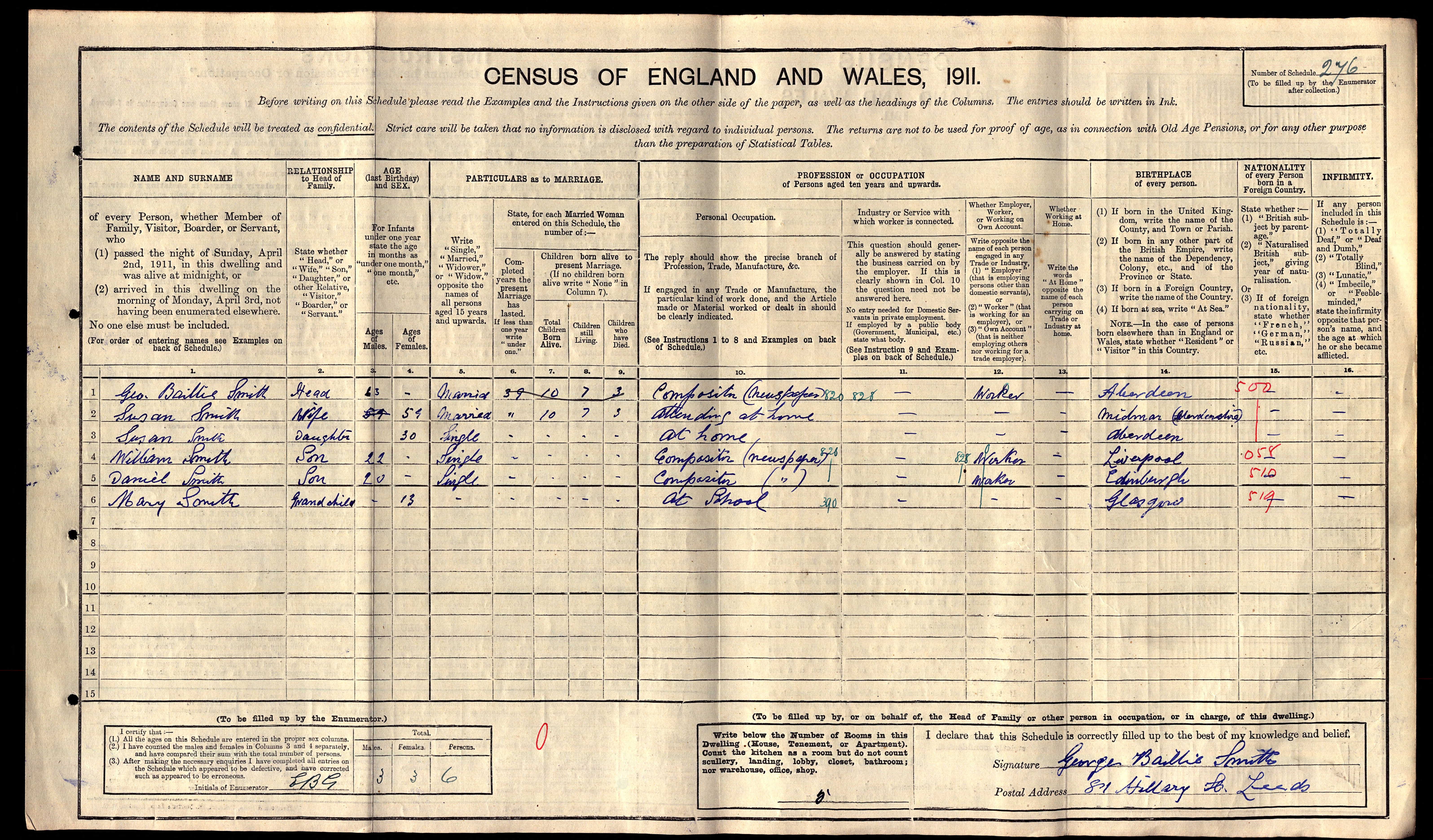 At this point, I have to admit, I fell face down into a rabbit hole.  The 1911 census has a very useful piece of information on it, namely the details of how long a couple has been married, how many children they had, and how many have died.  George and Susan senior had clocked up 39 years and 10 children.  Although 3 of them had died before 1911 and couldn’t possibly be our diarist, I still needed to know who they all were in order to rule them out.  Given that the family had lived in Edinburgh, Liverpool and Leeds at various times, this was not an easy task and took a lot of time.