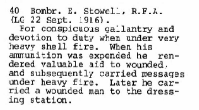 “Eric Stowell has got the DCM but everybody says he ought to have got the VC. But I suppose the fact is that there are so many people who have distinguished themselves that if VCs were given where they would have been given in the old days they would get far too common. I was speaking to Eric’s commanding officer yesterday and he told me not only had Eric done his own job absolutely without regard to the terrible shelling to which he and everybody else in the neighbourhood was subjected, but he went out in front of the trenches and brought wounded men in. Finally, when his turn for relief came, as men were short, he volunteered to stay on in the trenches and did so.” (1)