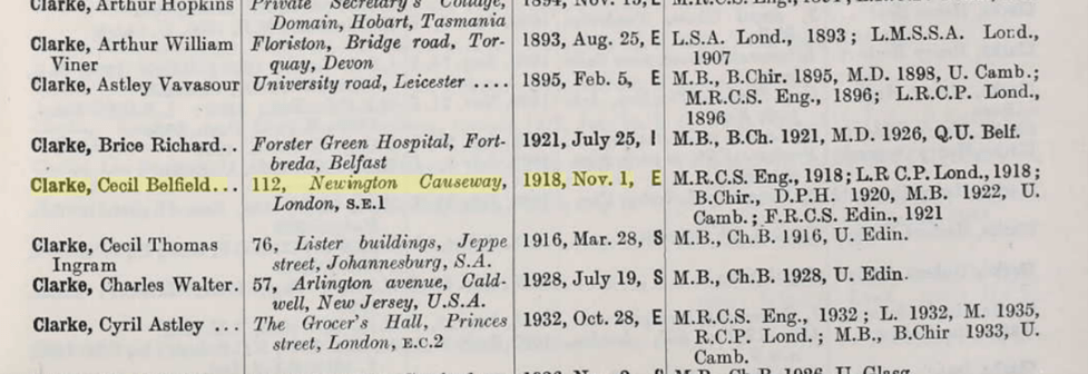 First up we have Dr Cecil Belfield Clarke. Born in 1894 in Barbados, Clarke won an island scholarship to study medicine at Cambridge. He arrived in London just after the outbreak of World War I, travelling on RMS Tagus, which has the great symmetry of later being used as a hospital ship. Studying medicine at St Catherines College, Cambridge, Clarke was awarded his BA degree in 1917. Between 1918-21, he went on to achieve 5 other medical qualifications, and set up his practice near Elephant and Castle. He would work from here for the rest of his career. He continued practicing there throughout the Blitz of WWII, determined to continue caring for his patients despite one side of his practice literally being open to the elements after bombing.