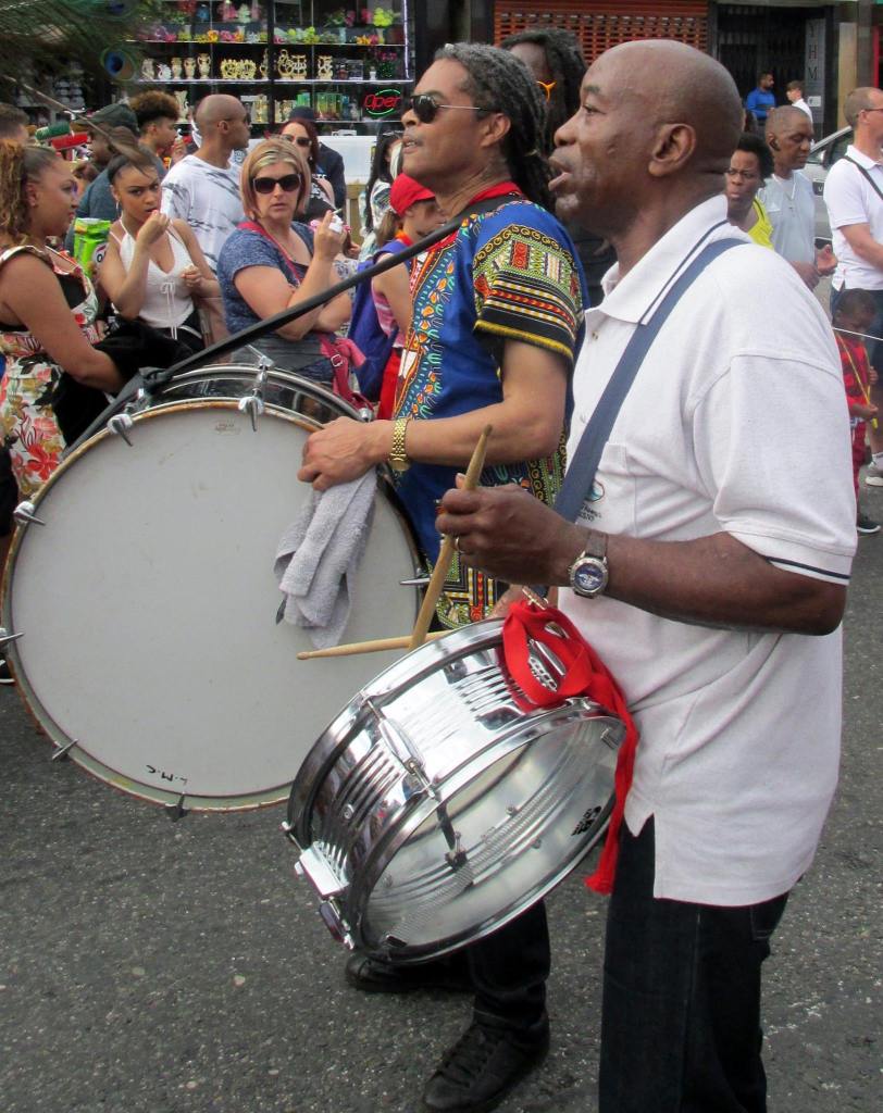 Military bands with Black musicians continued to appear in Leeds into the 19th Century and in 1843 a Trinidadian man named John Charles, with the 32nd (Cornwall) Regiment of Foot, played his big drum at the Leeds Zoological and Botanical Gardens. Both the 1749 and 1843 performances took place outside and it’s likely that the Black drummers with Sir Robert Rich’s Regiment of Dragoons were part of a procession along the streets of Leeds. They were known for riding on white or grey horses and were considered some of the best performers of their time. Another outdoor performance was documented in 1884 when a local Black man named Alexander Harris, the leader of his local Salvation Mission Army Band, played his kettle drum in the streets of Bramley. His Christmastime performance coincided with some carnivalesque performances in the Caribbean that traditionally take place during the Christmas period such as Jamaica’s Junkanoo and the Christmas Sports of St. Kitts and Nevis. In 1967 when the first Leeds West Indian Carnival took place the procession included a big drum and fife band made up of three self-taught local Black musicians; Henry Freeman on big drum, Prince Elliot on kettle drum, and Kenneth Browne on fife.
