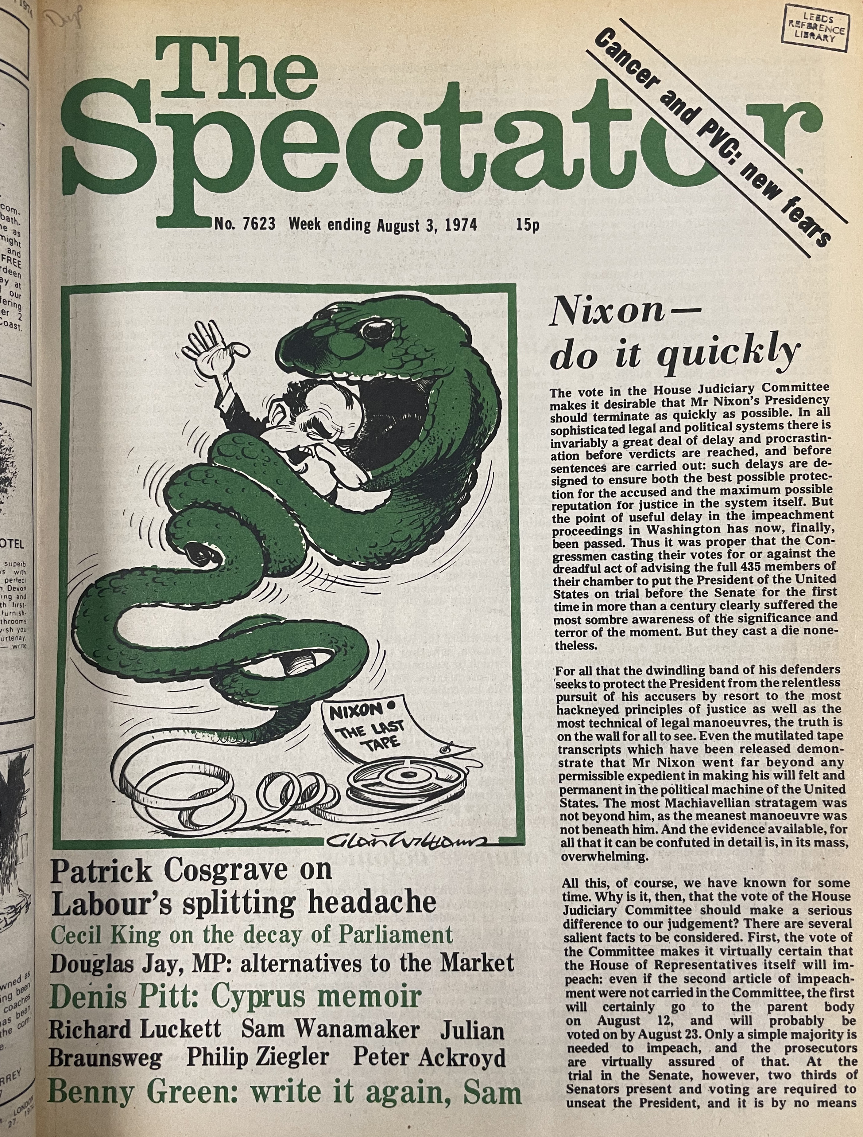 Any of those books will bring the reader closer to understanding the wider world of what is known with a very short-hand as ‘Watergate’. But perhaps the most effective way of experiencing those strange times as they unfolded, as well as the slow, ominous build to the climactic events of Watergate itself, is through contemporary reporting. Thankfully our collections are rich in such archival material – including significant runs of important current-affairs journals such as New Society and The Spectator, as well as digital access to the archives of UK newspapers like The Times.