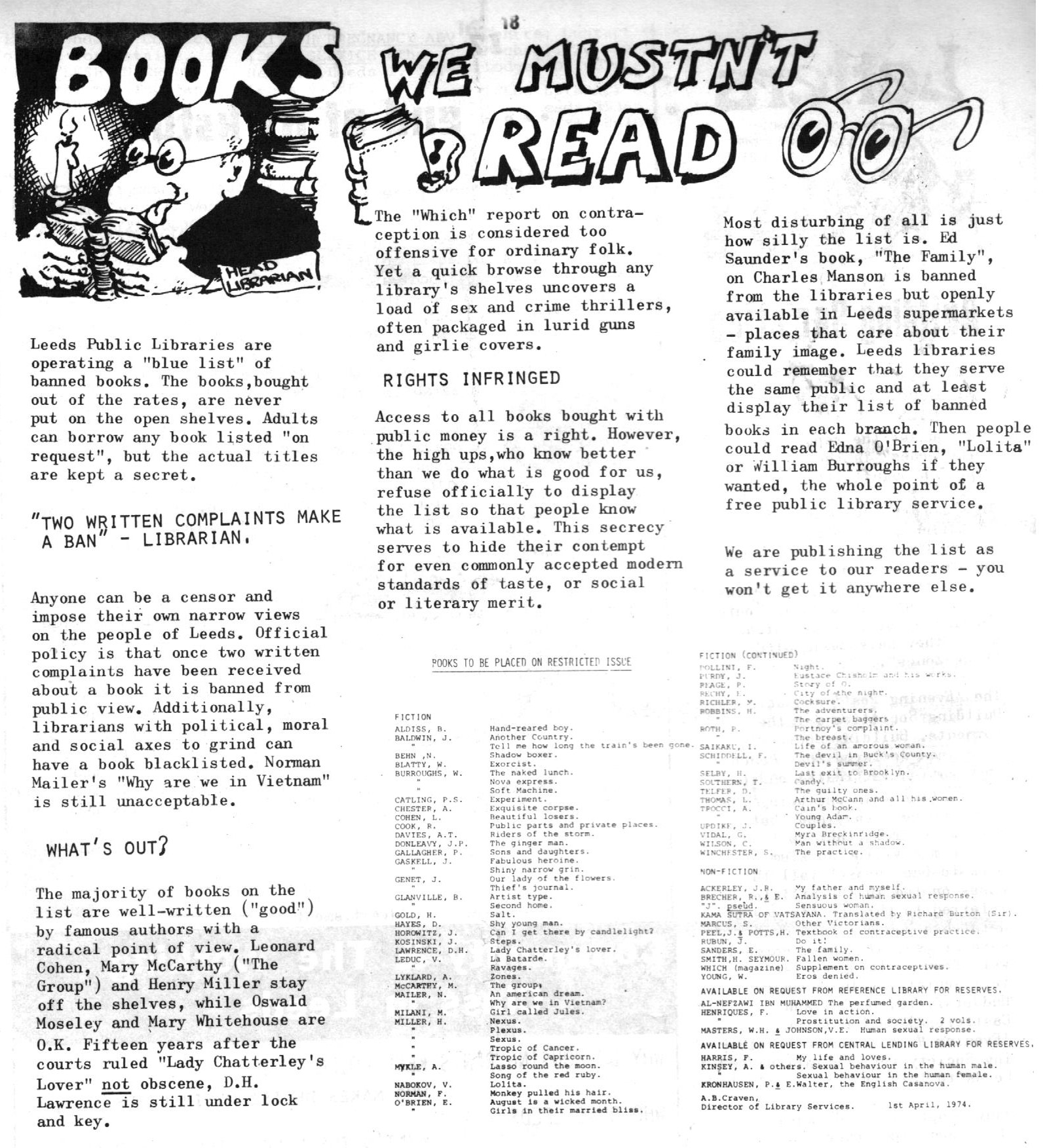 It’s Banned Books Week this week (September 22 to September 28). We’ve recently unearthed this wonderful list of books banned by Leeds (Public) Libraries in 1975 – or, if not quite banned entirely, at least only available with Librarian approval. While we definitely don’t operate in this way anymore, we thought it would be interesting (and slightly amusing!) to show you the list. How many of these titles do you recognise? How many can you find on our library catalogue today?