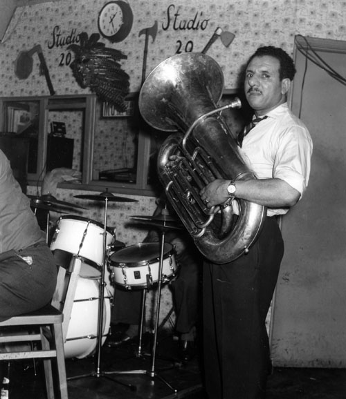 Another Black man that can easily be identified is Bob Barclay. The Leodis archive contains three photographs of Bob Barclay. This one was taken by photographer Terry Cryer in 1955 and shows Bob Barclay with his instrument of choice, the tuba. Bob Barclay was a master of his instrument and during his career he became known as King Tuba. Bob Barclay was born in Scotland in 1911 to a Scottish mother and a West Indian father. The Barclay family lived in various parts of Scotland and England in the early 20th Century but by 1918 they were living in Yorkshire. By 1946 Bob Barclay was living in the cellar of a house near the city centre of Leeds and was employed as a sheet metal worker. He began his music career in a brass band but by 1949 he had moved on to play jazz and was one of a small number of Black British jazz musicians performing during this period. His band, the Yorkshire Jazz Band played regularly around Leeds and Bob owned his own jazz club, Studio 20 on New Briggate. It was at Studio 20 that Terry Cryer took this photo. The Yorkshire Jazz Band began their recording career in 1949, making Bob Barclay the first Black musician from Leeds to record. The Yorkshire Jazz Band released a number of records throughout the 1950s. A few years after this photo was taken, in 1961, Bob Barclay and the Yorkshire Jazz Band performed a couple of gigs at the Cavern Club in Liverpool, sharing the stage with The Beatles on both occasions. The Yorkshire Jazz Band performed together into the early 1960s. They reunited in 1989 for their 40th anniversary but unfortunately Bob Barclay had passed away a few years earlier in 1987.