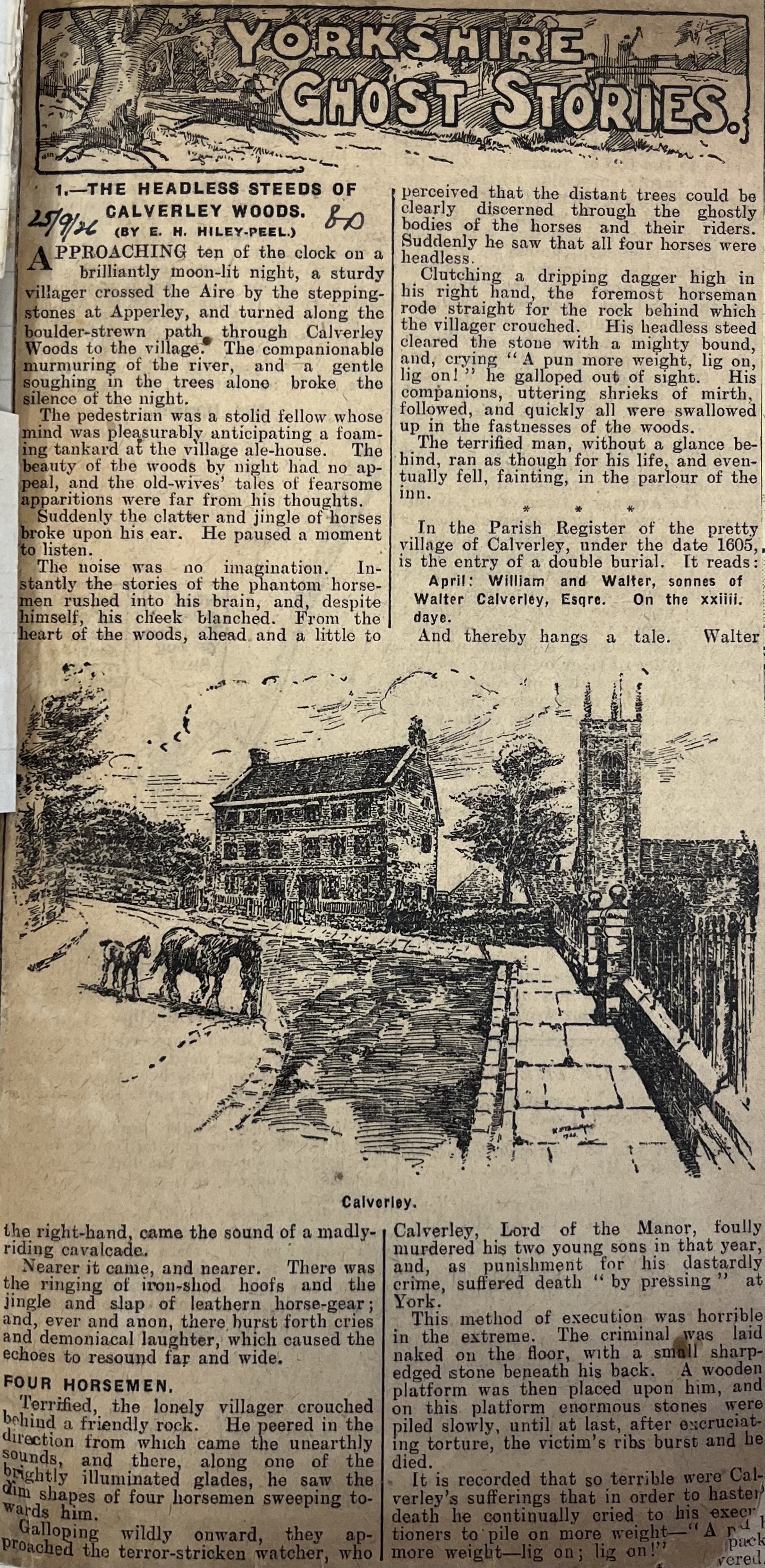 And thereby hangs a tale. Walter Calverley, Lord of the Manor, foully murdered his two young sons in that year, and, as punishment for his dastardly crime, suffered death “by pressing” at York.