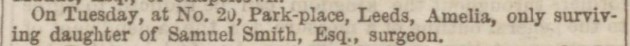 So, if the piece is essentially unplayable, how did it come to be published in the first place?  The printer, John Swallow of Leeds, was a letterpress and music printer.  Adverts in the local newspapers suggest that he was available for any printing needs, including subscription pieces.  It is probable that this was a private publishing exercise, a directly commissioned short run.  The story has a date of January 1855, but we don’t know if that was the date of composition, or the date of Amelia’s death.  Consulting the trade directories we found that Swallow relocated to Albion Street by 1870 so the piece must have been published in that 15-year window. An initial search for Amelia Smiths who died between 1855 and 1870 returned over 100 results – when we narrowed it to Leeds there was just one in October, November or December of 1857. A trawl of the obituaries in the newspapers gave us this: