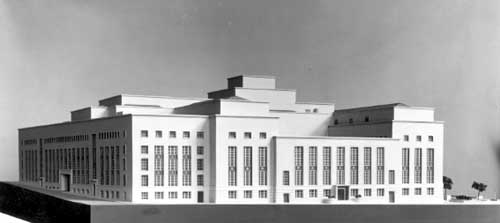 This model made by Partridges of London was of a proposed cultural centre for Leeds. It was to be on the site of the existing Library, extending across to Cookridge Street. The Library, Art Gallery and Museum Services were all to be housed together. The Second World War halted the plan, it was never carried out. (c) Leeds Libraries, http://www.leodis.net