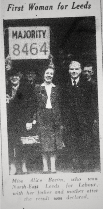 Photograph from the Yorkshire Evening Post, 26th July 1945. Shows Bacon celebrating with her parents after finding out she won the seat for Leeds North East.