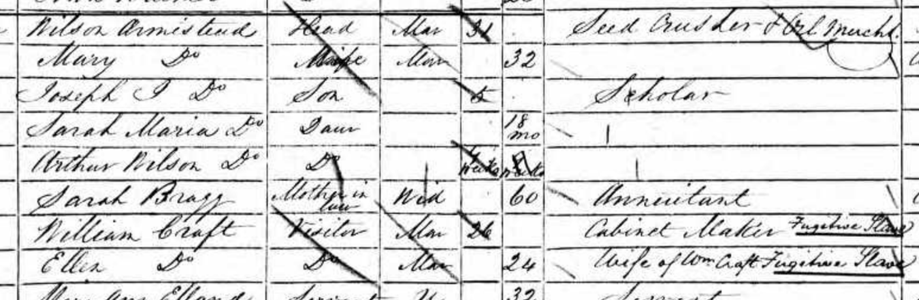 Census record from 1851 when the Crafts were living in Leeds. You can see on the right hand side where the pair have been listed as ‘fugitive slaves’.