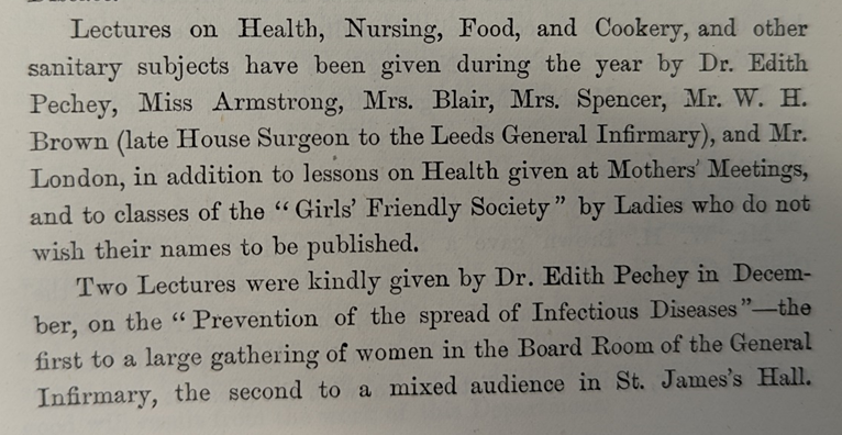 In the 1882 annual report for the Ladies Council, Pechey is listed as being among the lecturers for their health department. In that year she gave two speeches to large audiences, one of exclusively women, about prevention of infectious diseases.