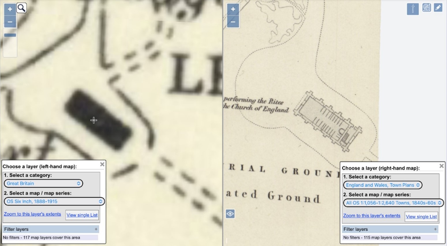 It might be possible that the creator (unknown to me) of this drawing on the map was able to go into so much detail because they were privy to the plans and drawings which had been created and existed at the time of establishing the cemetery (opened 1845) to allow the Corporation to allocate the funding for the necessary building works. It is interesting to see the level of detail internally including what appears to be the pews and the pulpit and internal steps leading to the roof space.
