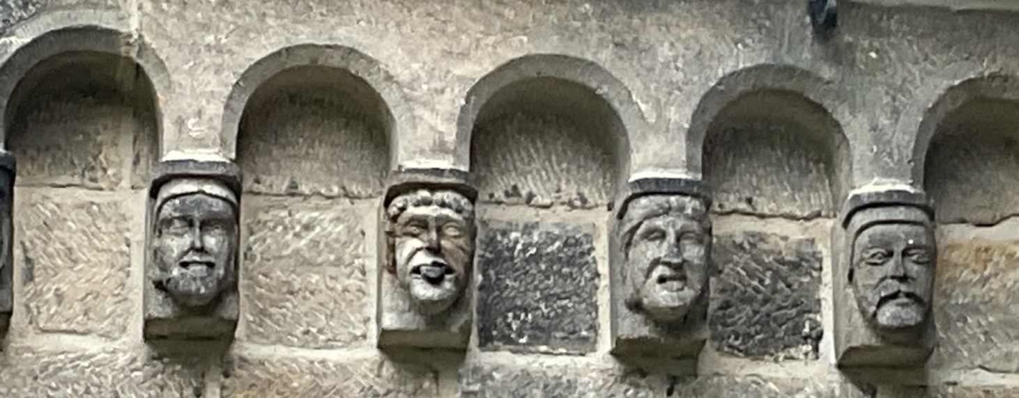 The carved faces on the corbels around the building are called Grotesques (usually a word used to describe something that is hideous, ugly and disgusting) and some were thought to have been used for the purpose of teaching biblical lessons at a time when many people did not read, or to ward off evil spirits and protect the people inside the building. The ones on this building look more humorous and friendly than fearsome! I am assuming that our chapels had similar decorative elements.