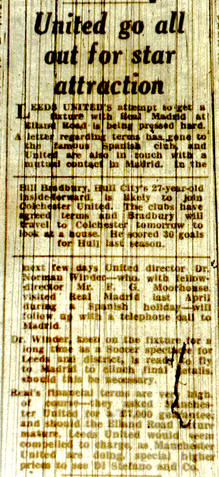 So where does the Madrid element of this story come from? There were a few Real Madrid rumours and stories linked to Leeds before Revie became team manager. On the 10th of September 1959 it was reported in the YEP that United were trying to attract Real to the city for a friendly for which Madrid were asking approximately £7,000, an incredible sum at the time. Two directors had travelled to Madrid in 1959 apparently on holiday and were reported to be “following up with a phone call”. Quite a story, I wonder who paid their expenses!