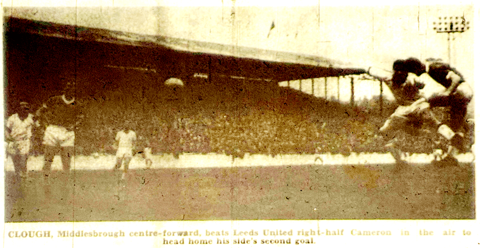 HOWEVER, the YEP were starting to use photography much more by now so we can present here what we think is the first ever action shot of Leeds United playing in an all-white strip at Elland Road. Unfortunately, it shows Brian Clough scoring for Middlesbrough. Thankfully we can balance out with this smaller photo of a Leeds goal that day as well.[2]