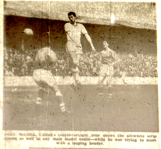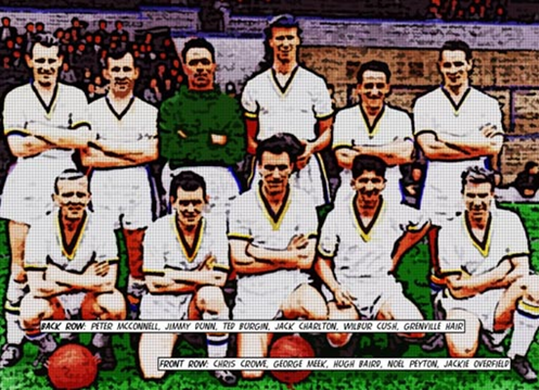There is a very good reason for not much being made of the “official” kit change under Jack Taylor, it had been used before. There are photos of Leeds during a pre-season tour of Scotland in1958 using a white kit (A young Jack Charlton appears in this photo) and in fact the all-white strip was used as the change kit during the 1958-59 season.[6] [7]