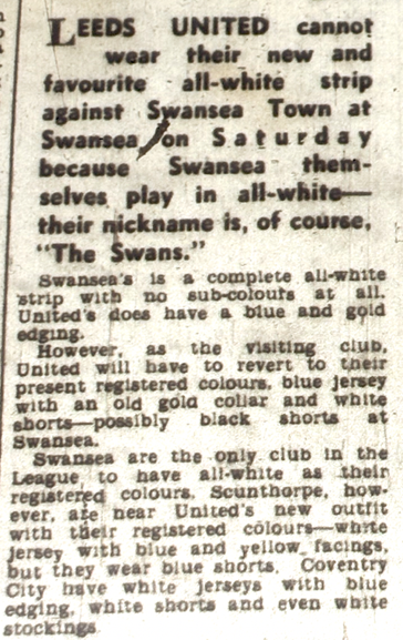 Leeds continued with the white strip when they could that season but had not officially registered this strip at the start of the season so when kit clashes with clubs like Swansea came up, they had to revert to blue and gold as this YEP article from Tuesday 17th November 1960 mentions. However, it’s clear that the decision to change to all white had been made well before Don Revie was manager.