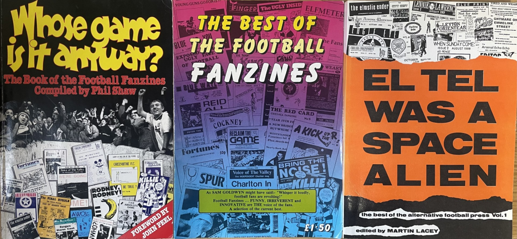 Strangely, perhaps, for a subculture that had really only emerged half a decade before, football fanzines had already reached self-awareness by the late 1980s, with a developed sense of their own lineage and mythology. Several compilations of now-obscure titles preserved in print the richness of this world. You can find copies of them in our library collections – including El Tel Was a Space Alien: The Best of the Alternative Football Press, Vol. 1, edited in fact by the aforementioned Martin Lacey; Whose Game Is It Anyway? The Book of the Football Fanzines; and The Best of the Football Fanzines.