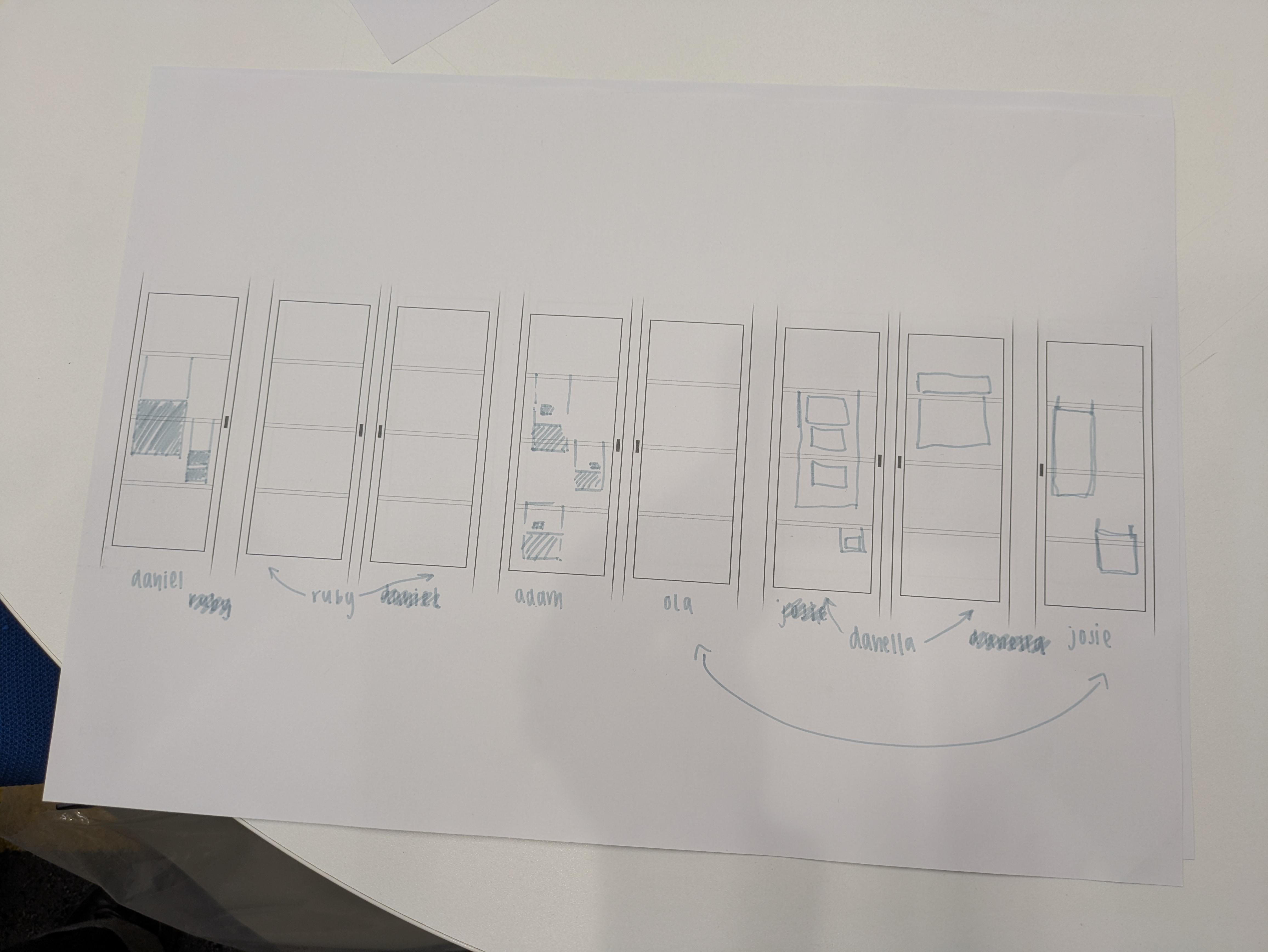 We had a few ideas that involved hanging large-format prints from the balcony above, but health and safety considerations—as well as the potential cost of prints—checked our enthusiasm for this approach. Instead, we decided to make full use of the large glass cabinet bookshelves at the far end of the room, with Daniel suggesting we use the weight of the books to secure prints mounted on perspex to the bookshelves. When it became apparent that we needed to avoid preventing access to the books behind, we settled on a compromise where we’d print onto long sheets of a robust paper stock, folded at the edge of the bookshelf. The prints would hang below each shelf and could be lifted, to allow access to the books behind. To ensure the paper wouldn’t curl, we also took the additional step of spray mounting sections of 5mm foamboard to the prints.