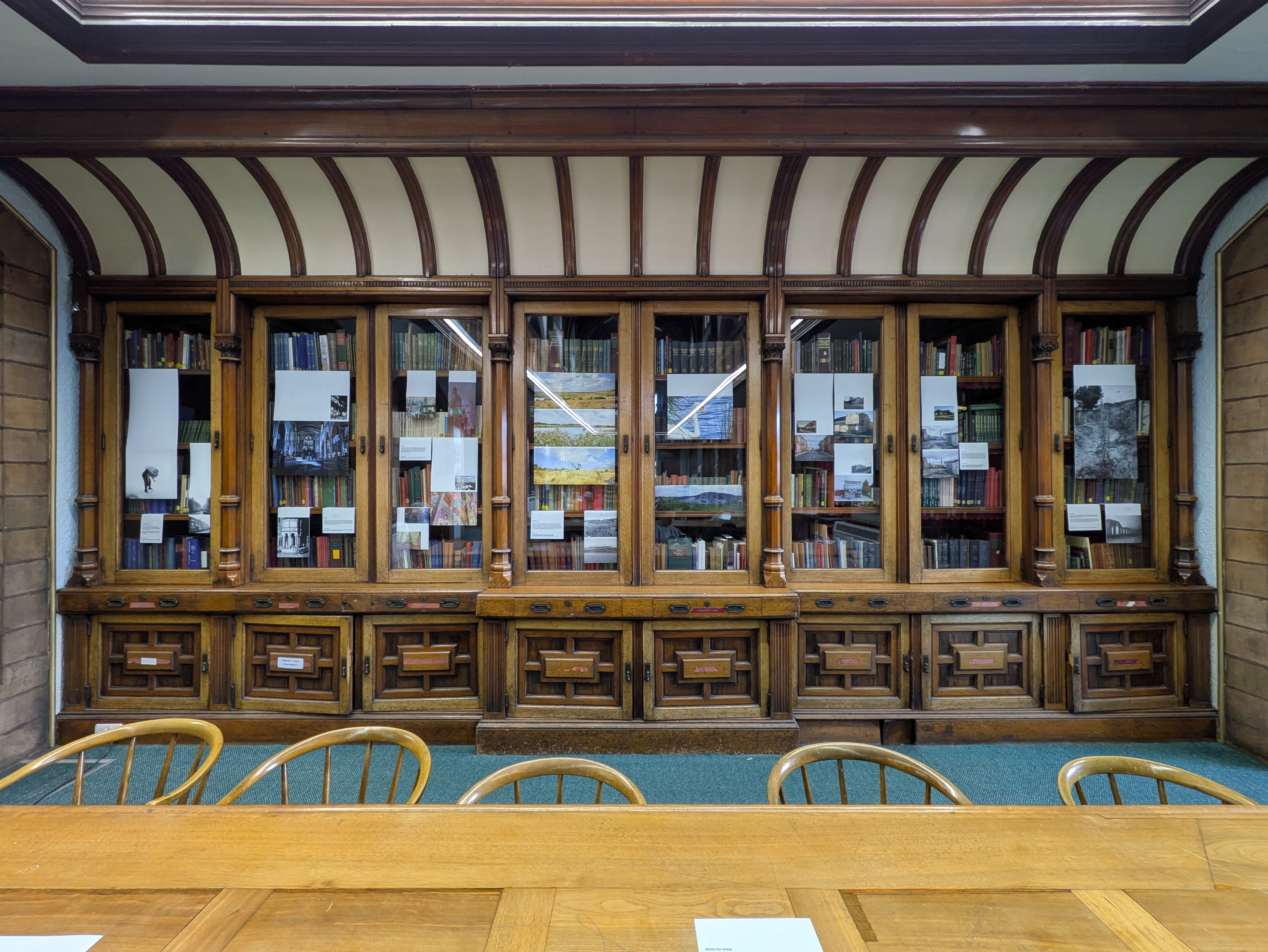 Six of us went on to show our work in the Local and Family History Library, where we were given the freedom to design an exhibition that made use of the unusual attributes of the space. This presented a challenge to us, as the space bears little resemblance to the conventional gallery environments we’d grown accustomed to over the past few years. Unlike the familiar white walls of the studio or exhibition spaces in which we’d previously shown work—designed to neutralise their surroundings and place full emphasis on the art—the library is defined by its permanent fixtures: rows of bookshelves, informational displays, and reference desks. Rather than a blank canvas, it is a lived-in, historically resonant environment, requiring us to reconsider how our work might occupy space, negotiate context, and remain visible without disrupting the library’s primary function as an archival and research resource used by the general public.