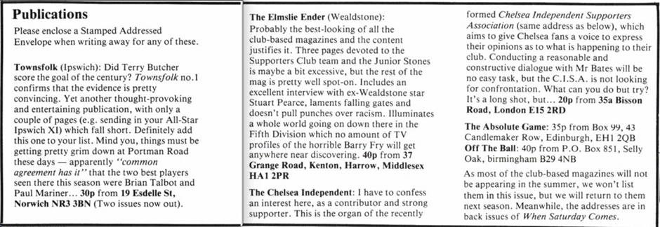 In print there are partial lists in some old books[2]  and we’re grateful to the National Football Museum and National Library of Scotland for the list of fanzines in their excellent collections. Then there are back copies of When Saturday Comes (WSC), the best-known football fanzine of them all.